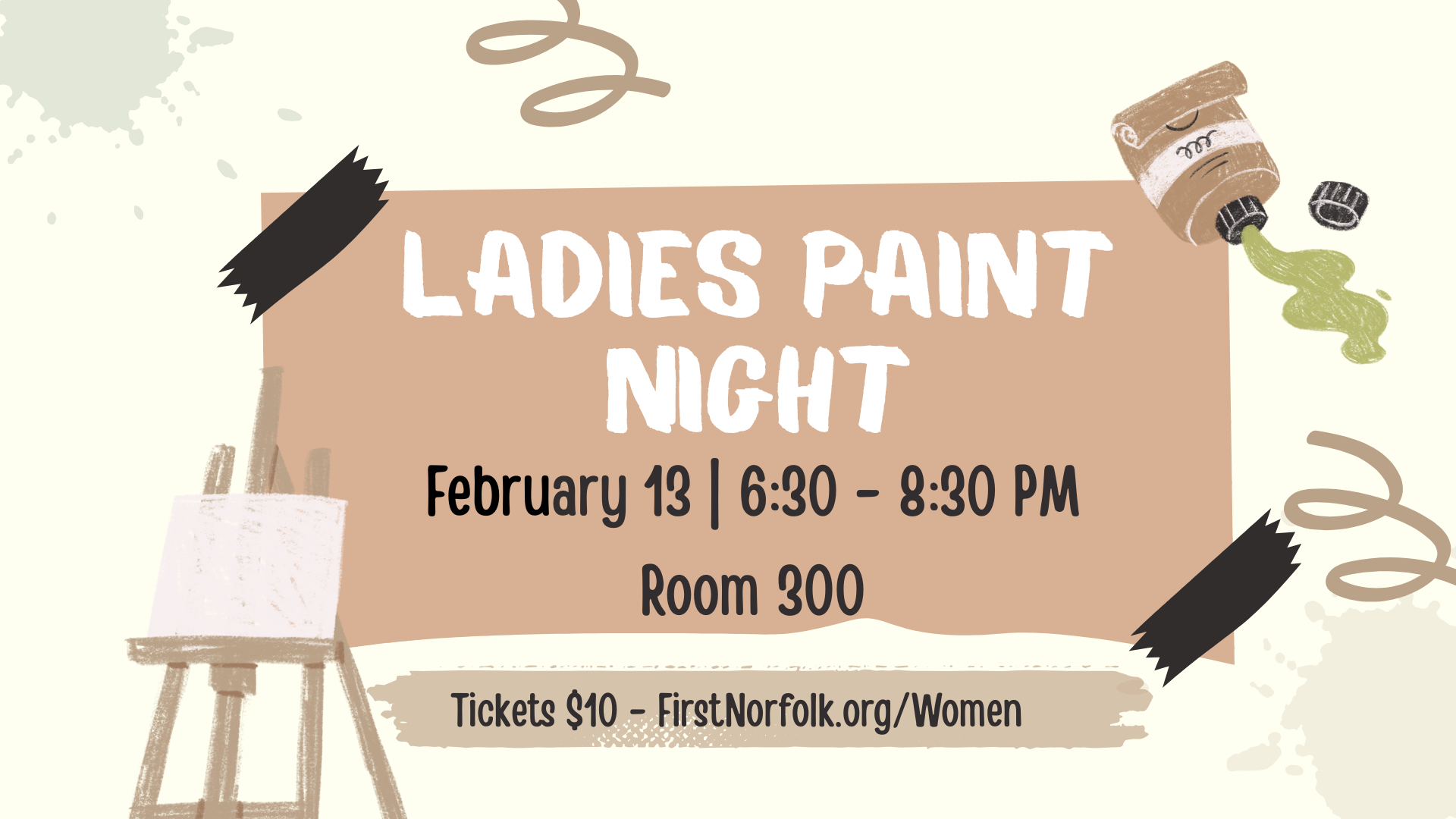 Come on out and join us on February 13 from 6:30–8:30 PM in Room 300 for fellowship and a fun Paint Night!